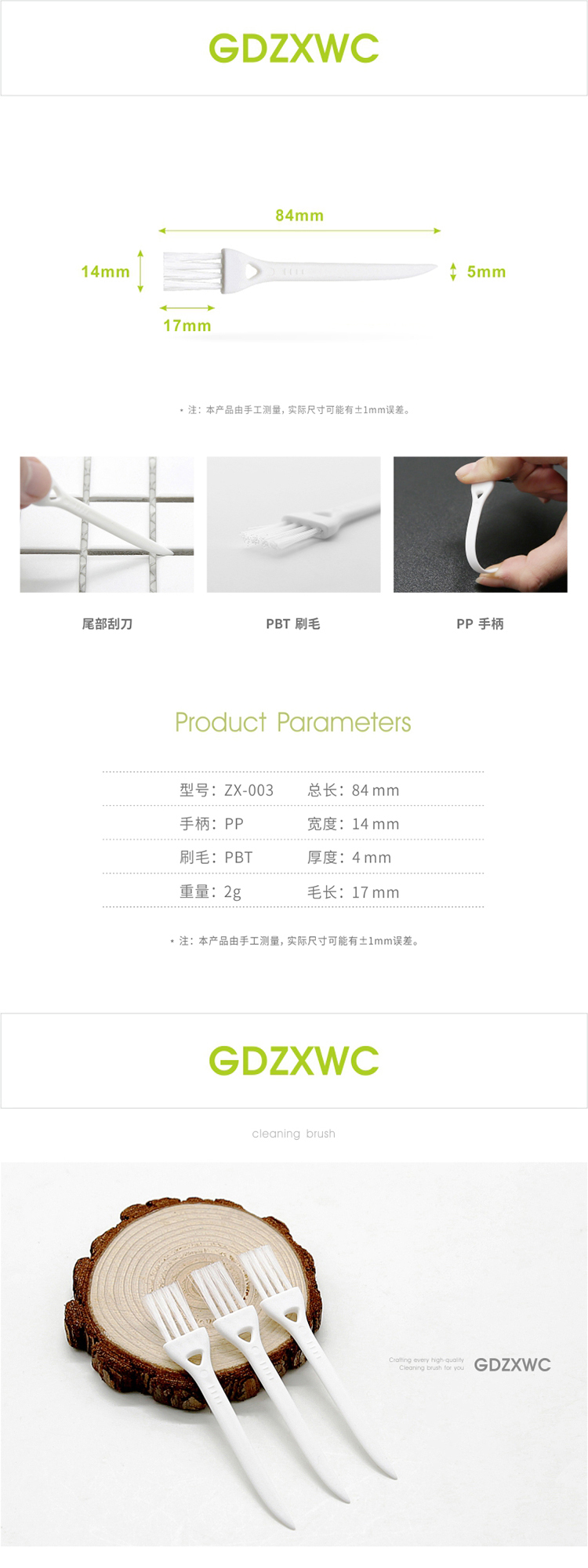 • 型號:ZX-003 白柄白毛,這是一款剃須刀清潔刷,PP手柄+尼龍刷毛,適用于小家電清潔、家居清潔 ......