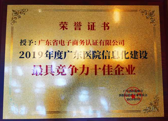 大會上,廣東省醫院協會及醫院信息化專業委員會為 “2019年度廣東醫院信息化建設最具競爭力十佳企業“的企業頒獎,網證通獲此殊榮,胡靜副總經理代表網證通出席頒獎儀式領取獎牌。