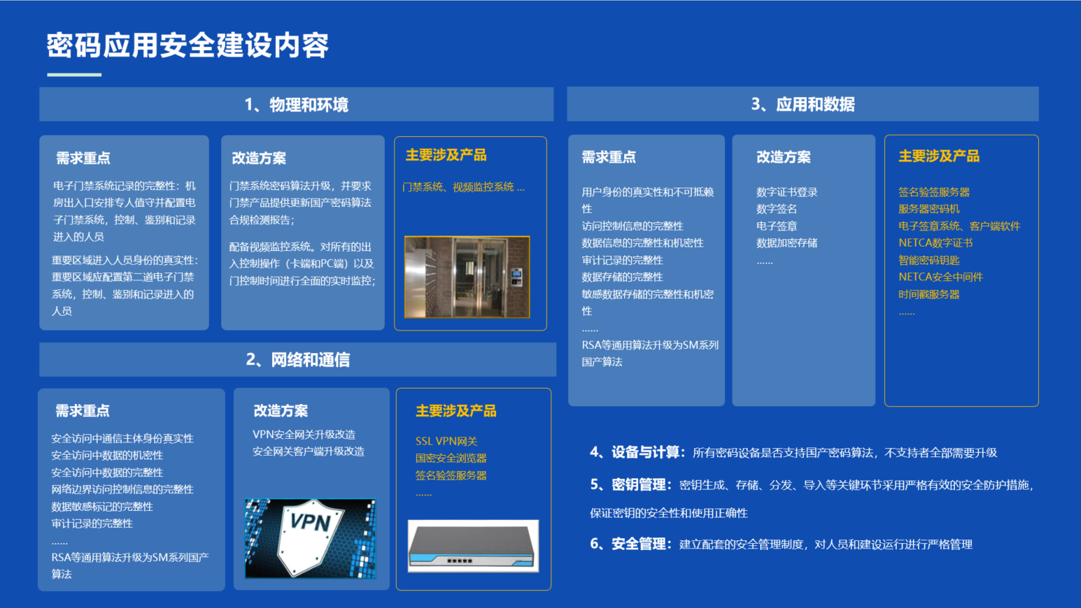 提供身份鑒別服務、數據傳輸安全、數據存儲安全、可信數據驗證等密碼服務。