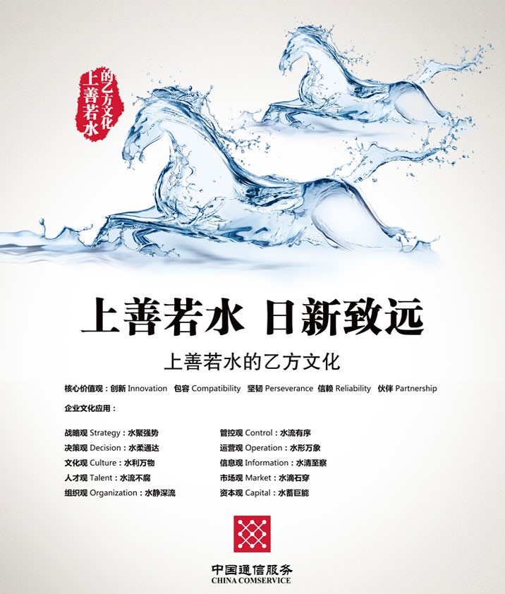 中國通信服務(wù)將水的至善品格融入到公司文化及經(jīng)營發(fā)展當(dāng)中:以 "重信賴、尚智慧、利萬物" 文化內(nèi)涵和 "創(chuàng)新、包容、堅(jiān)韌、信賴、伙伴" 的文化品格,在信息化領(lǐng)域中通過打造一體化的總承包服務(wù)能力,向客戶提供綜合信息網(wǎng)絡(luò)建設(shè)解決方案,從而整體實(shí)現(xiàn)股東、員工、行業(yè)、客戶和社會的價(jià)值,以幫助別人贏得自己成功。