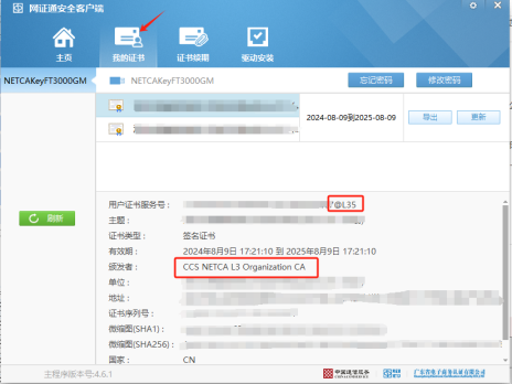 打開【網(wǎng)證通安全客戶端】-【我的證書】-【簽名證書】,查看【用戶證書服務號】尾綴,顯示@L35即符合本次免費更換證書業(yè)務 。