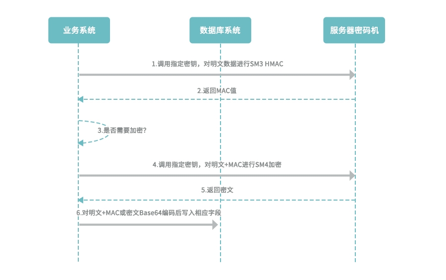 1. 業(yè)務(wù)系統(tǒng)在敏感數(shù)據(jù)寫入數(shù)據(jù)庫(kù)前,調(diào)用指定密鑰,對(duì)明文數(shù)據(jù)進(jìn)行SM3 HMAC進(jìn)行完整性保護(hù);